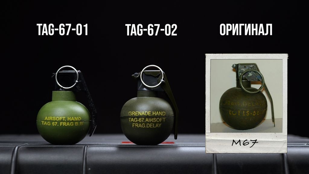 Страйкбольная граната TAG 67 FRAG.B.B. размерами и пропорциями повторяет свой боевой аналог. Даже шов, находится в том же месте, где у боевой гранаты. Отличается только «горлышко» корпуса, у боевого аналога оно более узкое. Корпус изготовлен из специального вспененного пластика. Наружная поверхность стилизована под текстуру «тяжелого металла».